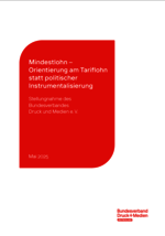 Der Bundesverband Druck und Medien e.V. (BVDM) begrüßt die Entscheidung der Mindestlohnkommission, dem politischen Druck zur Erhöhung des Mindestlohns auf 15 Euro nicht nachzugeben. Dennoch werden die Erhöhungen in zwei Schritten auf 14,60 Euro bis 2027 Betriebe und Tarifpartner stark belasten.