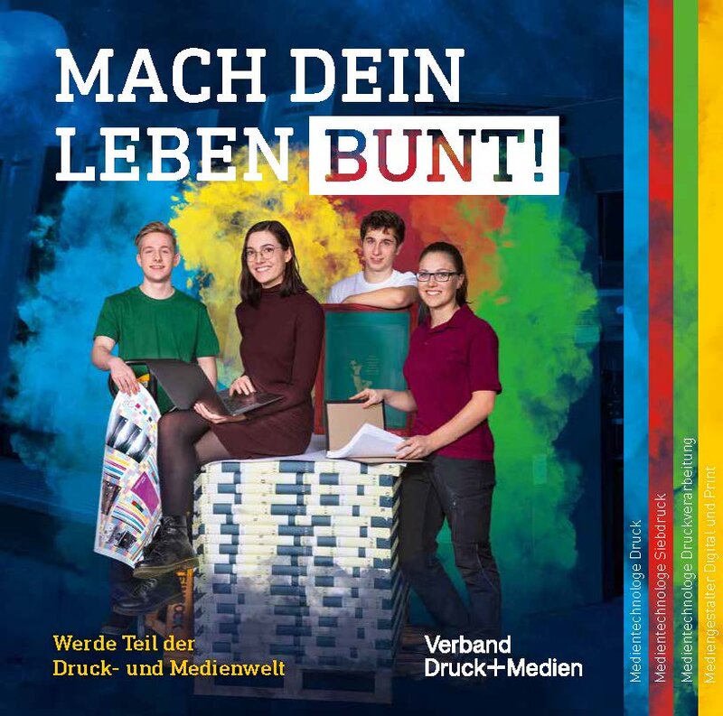 In der Broschüre „Mach Dein Leben BUNT!“ werden die Ausbildungsberufe Medientechnologe/-in Druck, Medientechnologe/-in Siebdruck, Medientechnologe/-in Druckverarbeitung und Mediengestalter/-in Digital und Print vorgestellt. Eine Auszubildende oder ein Auszubildender präsentieren den Beruf mit einem Zitat. Neben einer kurzen Darstellung der Ausbildungsinhalte werden die Anforderungen an die Jugendlichen sowie Fun-Facts aufgeführt. Das Ganze kurz, knapp und ansprechend. Auf dem Titel ist als Eyecatcher das „BUNT“ mit einer changierenden Glanzfolie hinterlegt. Die einzelnen Berufe lassen sich über ein Register direkt aufschlagen. Am Ende der Broschüre finden sich allgemeine Informationen zur Ausbildung, wie beispielsweise Weiterbildungsmöglichkeiten, Ausbildungsvergütung und Verweise zu Stellenbörsen.