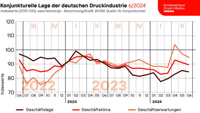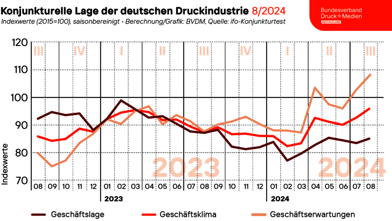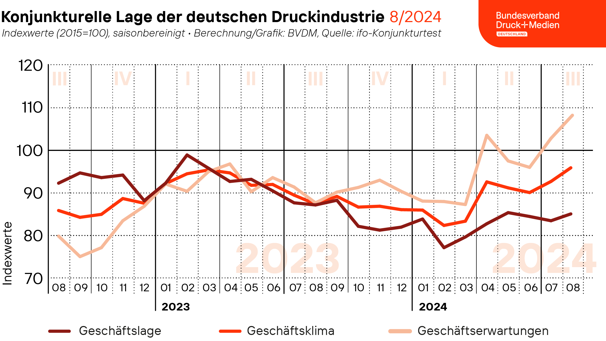 Nach dem Zuwachs im Juli verbesserte sich die Stimmung der Unternehmen in der deutschen Druck- und Medienwirtschaft im August erneut deutlich. Der vom Bundesverband Druck und Medien berechnete Geschäftsklimaindex verzeichnete saison- und kalenderbereinigt rund 3,5 Prozent über dem Vormonatswert. Mit 96,1 Punkten erreichte der Index das höchste Niveau seit dem Beginn des Ukrainekriegs im Februar 2022 und notierte damit rund 9,7 Prozent über seinem Vorjahresniveau. Maßgeblich bestimmt wurde die Verbesserung des Geschäftsklimas durch den Anstieg der Geschäftserwartungen, während der Geschäftslageindex hingegen nur leicht zulegen konnte.