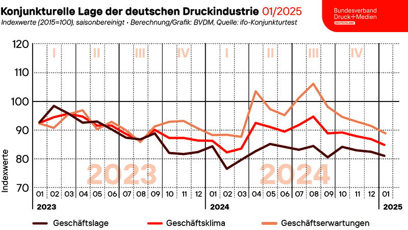 Zum Jahresbeginn 2025 verzeichnete das saison- und kalenderbereinigte Geschäftsklima der deutschen Druck- und Medienwirtschaft eine erneute Verschlechterung und folgt damit weiter dem negativen Trend der letzten zwei Monate. Sowohl die Geschäftssausichten für die nächsten 6 Monate als auch die aktuelle Bewertung der Geschäftslage der Betriebe fielen im Vergleich zum Vormonat schwächer aus. Der vom Bundesverband Druck- und Medien errechnete Geschäftsklimaindex verzeichnete eine saison- und kalenderbereinigte Abnahme von 2,3 Prozent im Vergleich zum Vormonat. Mit 85,1 Punkten notierte der Index im Januar 1,7 Prozent unter dem Niveau des Vorjahres.