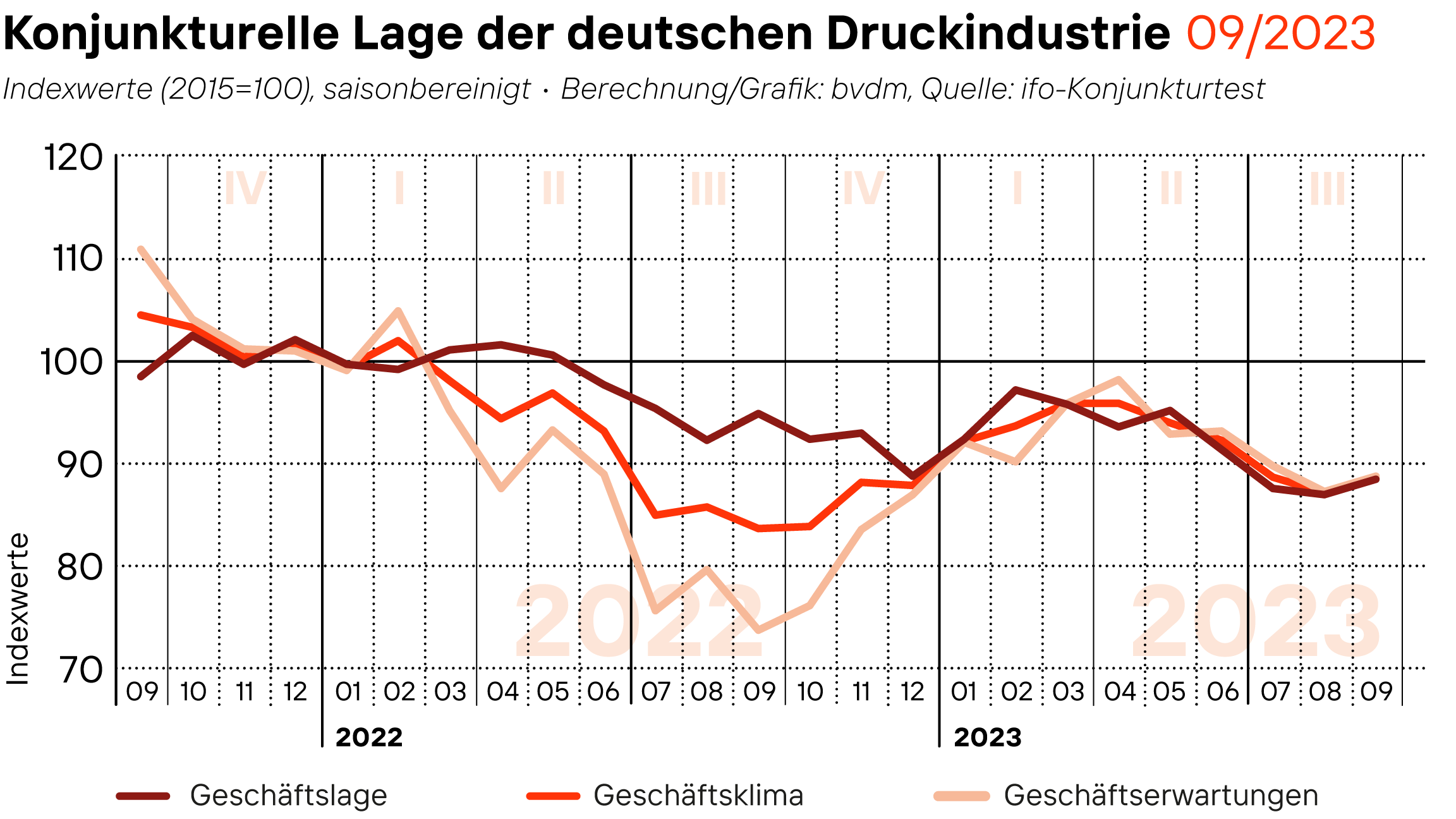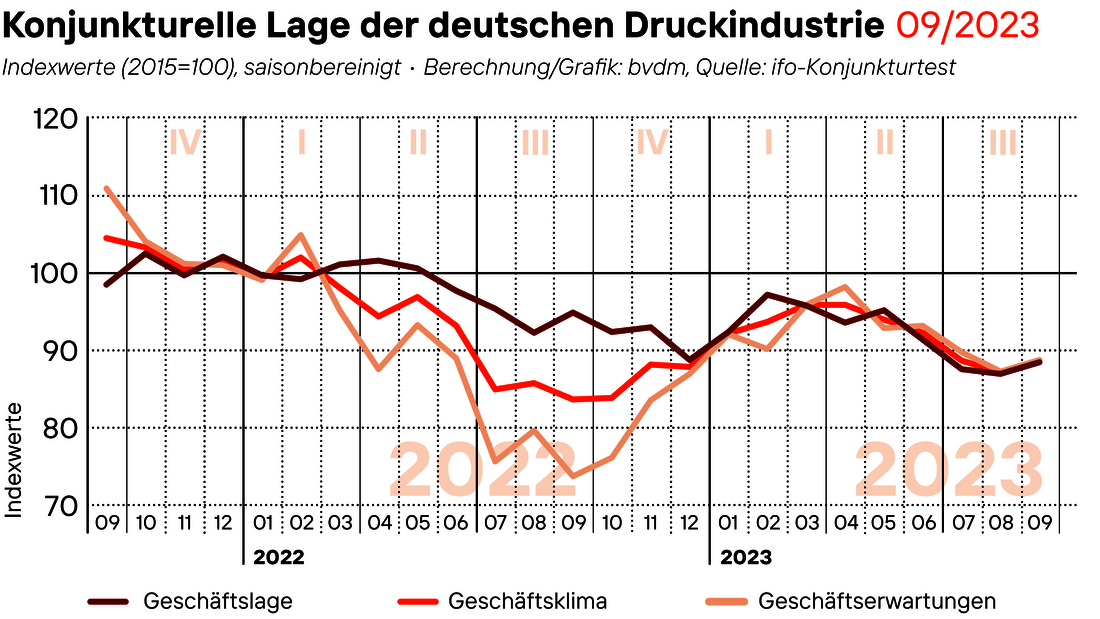 Berlin, 29.09.2023. Im September 2023 stabilisierte sich das saison- und kalenderbereinigte Geschäftsklima der deutschen Druck- und Medienbranche etwas. Sowohl die Geschäftslageeinschätzung als auch die Geschäftserwartungen hinsichtlich der nächsten 6 Monate waren im Vormonatsvergleich leicht positiv. Der vom Bundesverband Druck und Medien (bvdm) berechnete Geschäftsklimaindex stieg saison- und kalenderbereinigt um 1,7 Prozent im Vergleich zum August an. Mit 88,8 Punkten notierte der Index rund 5,9 Prozent über seinem Vorjahresniveau. Die anhaltende Auftragsschwäche sowie eine Verschlechterung der Ertragslage sorgen jedoch dafür, dass die Einschätzungen der Druck- und Medienunternehmer trotz leichter Zugewinne im September weiterhin überwiegend pessimistisch ausfallen.
