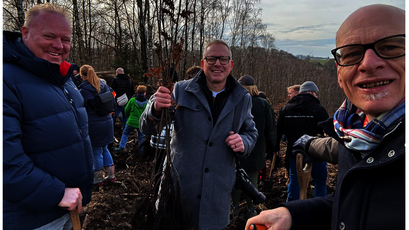 Die bundesweit erfolgreiche Klimainitiative der Druck- und Medienverbände hat in ihrer zweiten großen Pflanzaktion Ende Februar 2025 rund 2.100 Bäume am Krägeloher Berg bei Ennepetal gepflanzt. Stellvertretend für die Mitglieder der Klimainitiative Druck und Medien haben Stefan Brunken von der VDM Beratung und Erik Schwingen vom Etikettenwerk E. Huth aus Wuppertal sowie weitere 25 Mitstreiter Eichen und Buchen gepflanzt. Damit leistet die Initiative einen wertvollen Beitrag zum Wiederaufbau der durch Borkenkäferbefall und extreme Trockenheit geschädigten Waldgebiete in Deutschland.