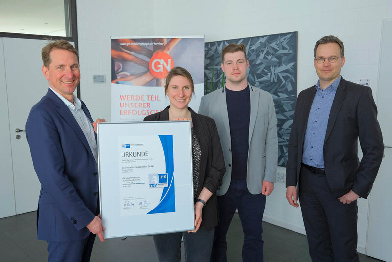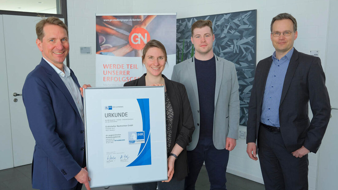 Nordhorn „Während der Ausbildung bieten wir unseren Nachwuchskräften eine umfassende Betreuung und fördern sie individuell. Damit möchten wir jungen Erwachsenen eine hochwertige und zukunftsorientierte Ausbildung bieten“, erklärte Jochen Anderweit, Verleger und Geschäftsführer der GN, bei der Auszeichnung als TOP-Ausbildungsbetrieb und ergänzte: „Wir freuen uns sehr, dass wir eines von acht Unternehmen in der Grafschaft sind, die diesen Standard erfüllen und unsere Anstrengungen mit dem IHK-Qualitätssiegel anerkannt werden.“ Die GN wurden von IHK-Hauptgeschäftsführer Marco Graf zum zweiten Mal nach 2018 mit der IHK-Urkunde für besondere Ausbildungsqualität ausgezeichnet.