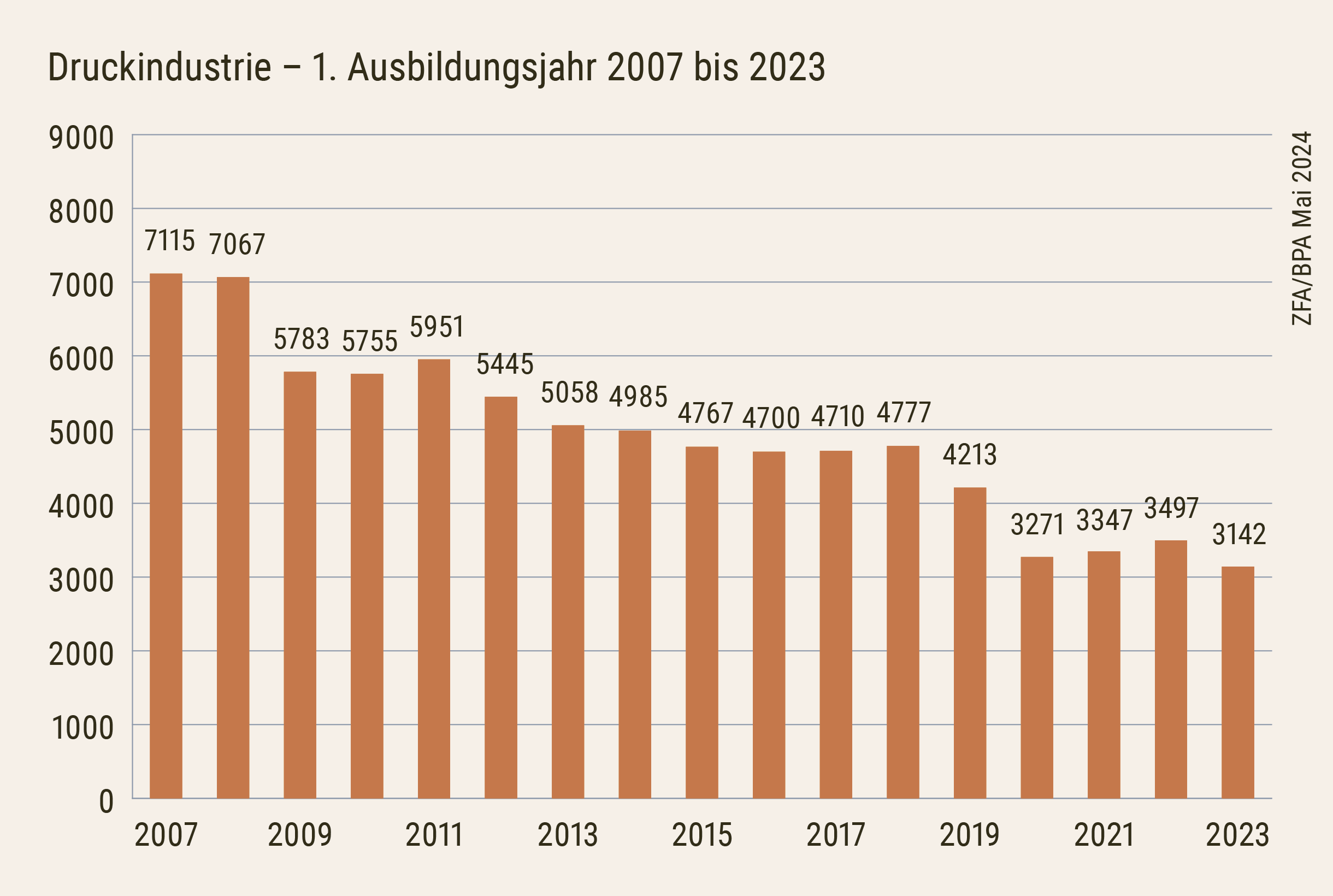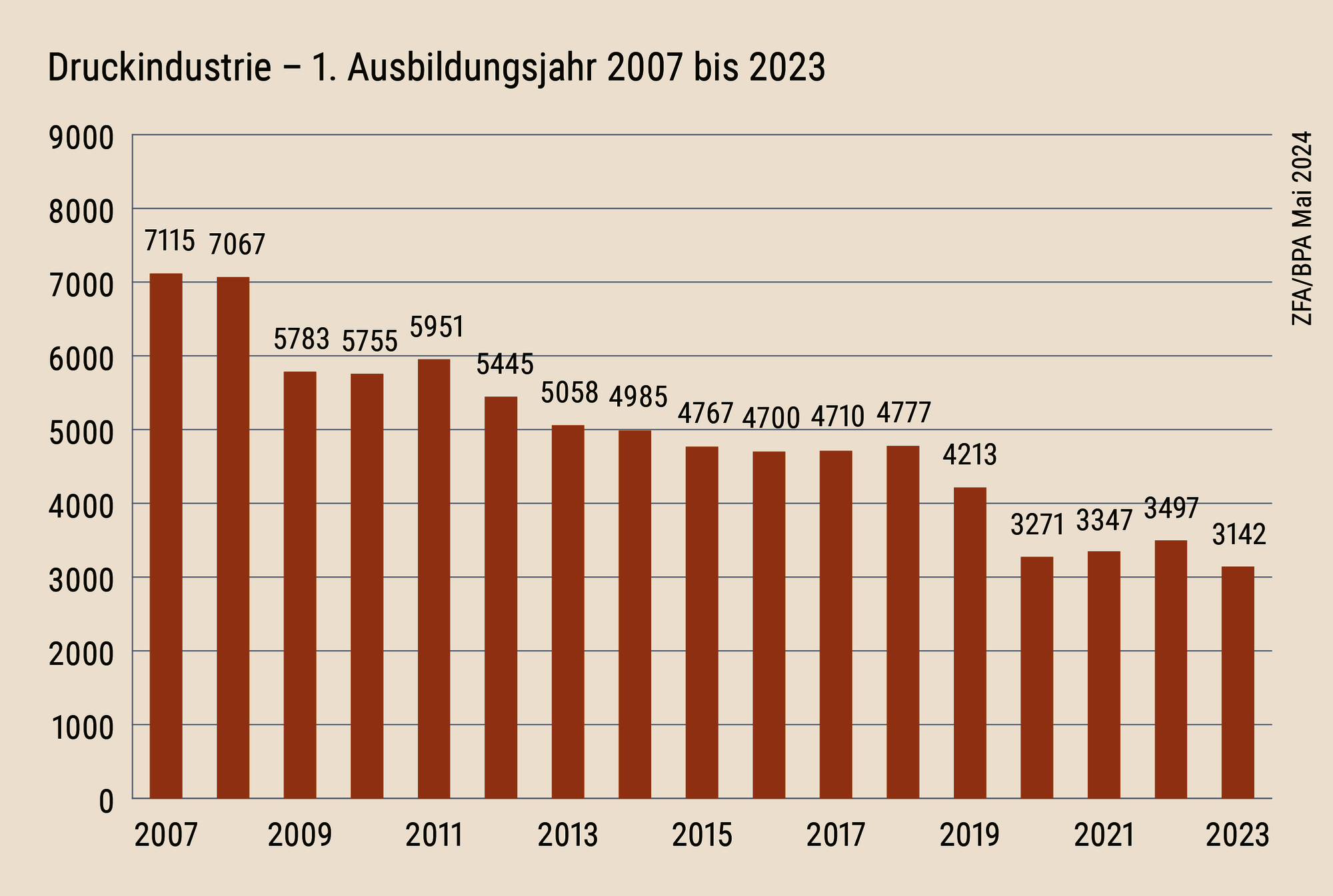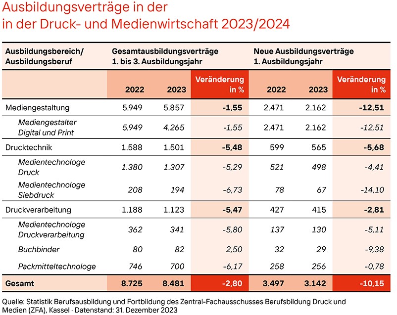 Der positive Aufwärtstrend in den Nach-Corona-Jahren bei den neu abgeschlossenen Ausbildungsverträgen hat sich bei den Druck- und Medienberufen nicht fortgesetzt. Mit lediglich 3.142 neuen Berufsanfängern ist ein Rückgang um 10,15 Prozent gegenüber dem Vorjahr zu verzeichnen. Besonders gravierend sind die Zahlen bei den Mediengestaltern Digital und Print gesunken.