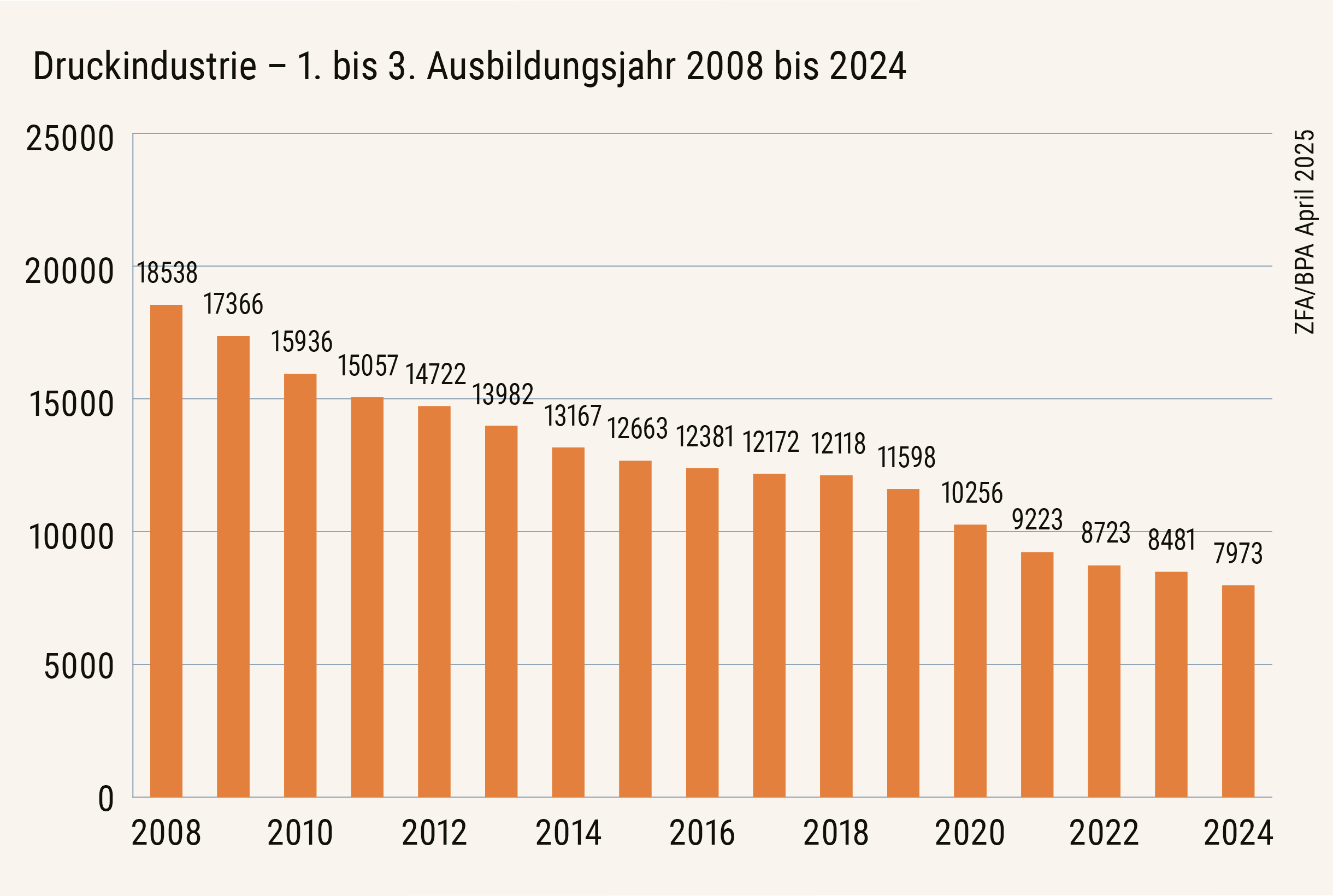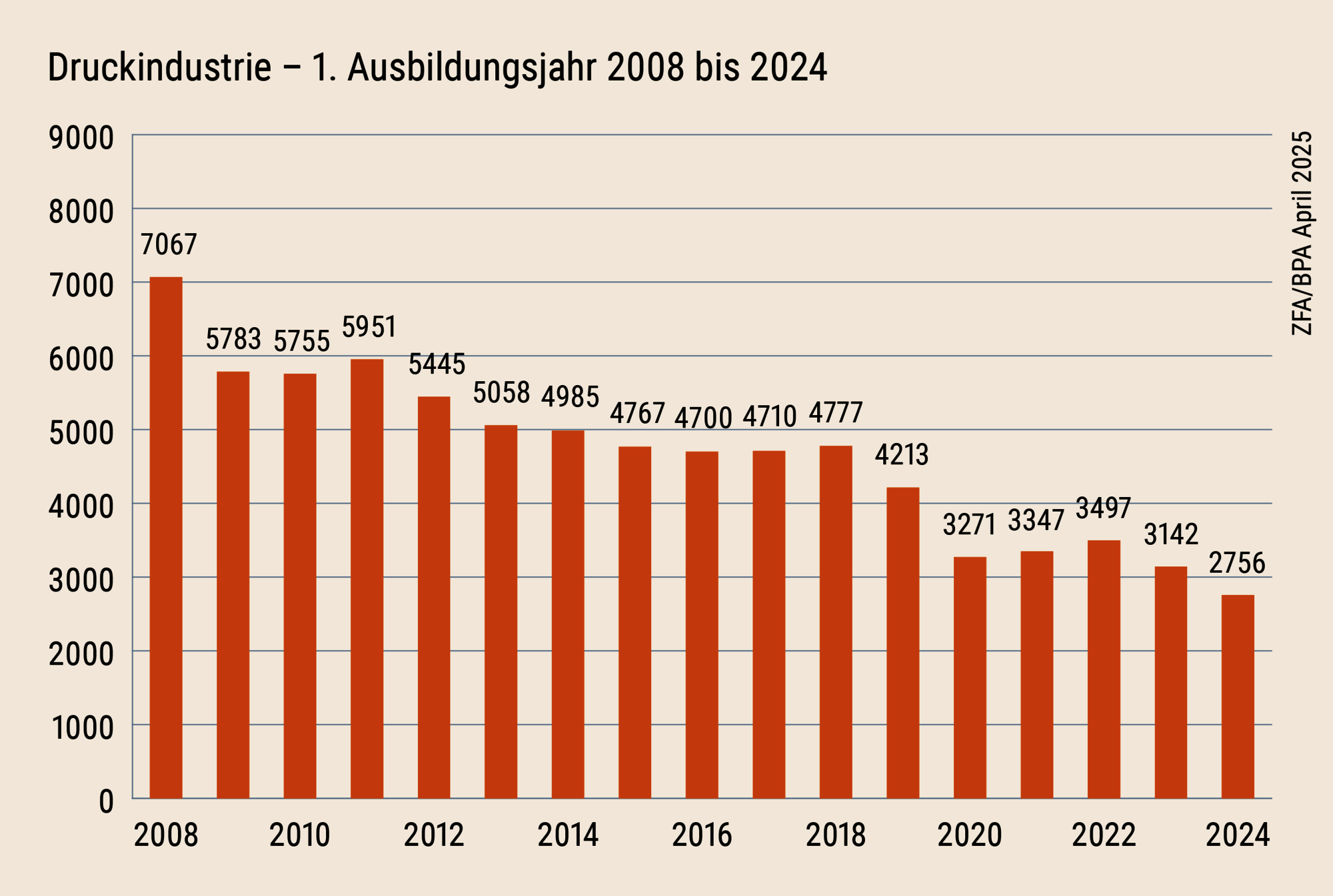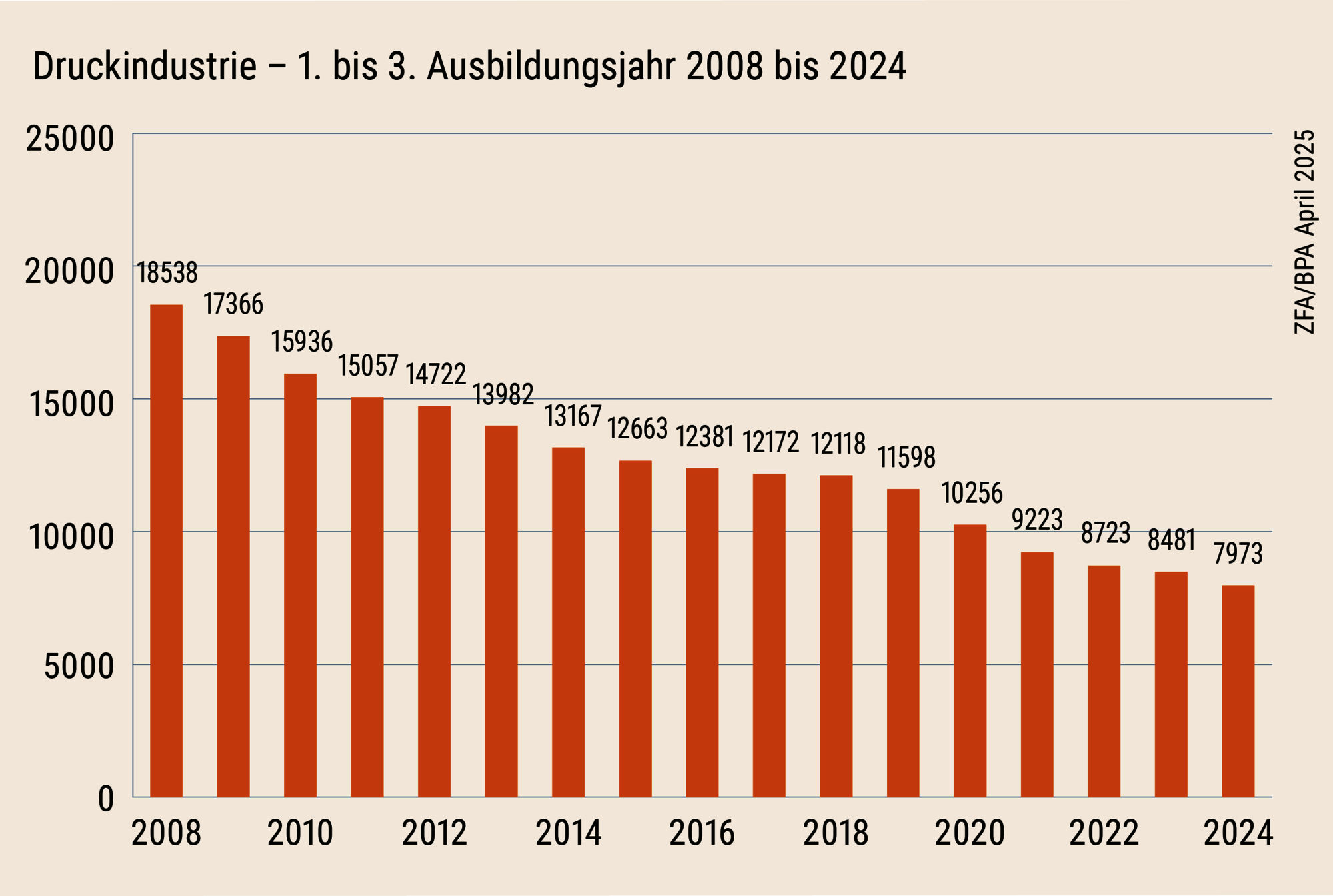 Für das Ausbildungsjahr 2024/2025 weist die Statistik nur noch 2.756 Neuverträge über alle Berufe der Branche hinweg aus – ein Rückgang von 12,3 Prozent gegenüber dem Vorjahr. Auch die Gesamtzahl aller Ausbildungsverhältnisse ist weiter gesunken: Mit 7.973 gemeldeten Verträgen wurde erstmals bei den Druck- und Medienberufen die Marke von 8.000 unterschritten – ein Minus von 6 Prozent im Vergleich zu 2023. Im Jahr 2010 war diese Zahl noch doppelt so hoch – mit 15.936 Auszubildenden.