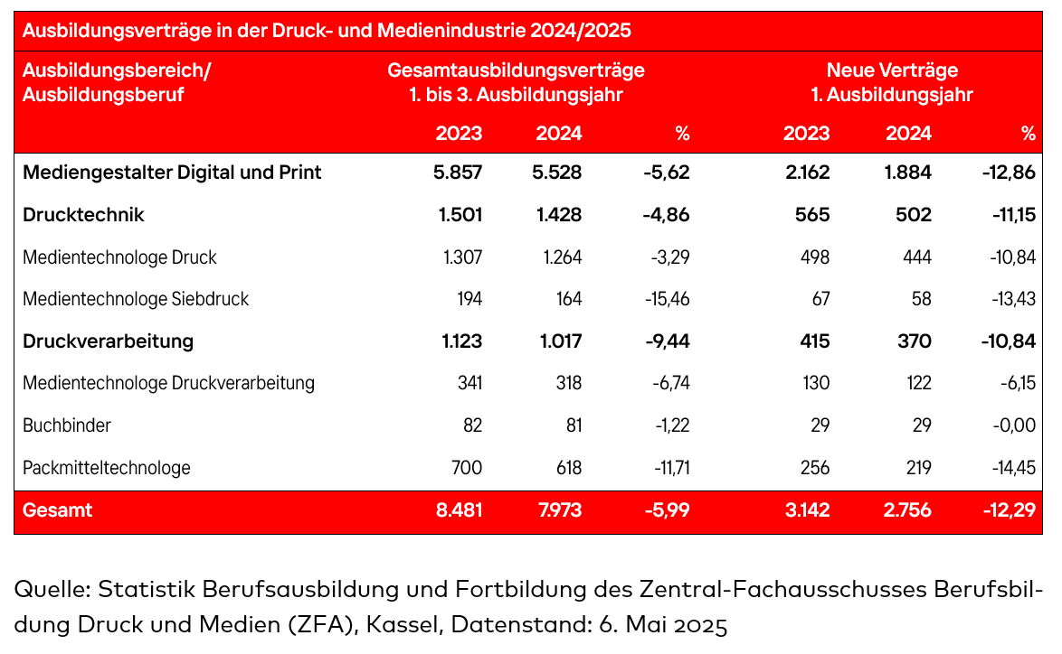 Die nachfolgende Übersicht und die Grafiken zeigen einen Ausschnitt aus der Statistik „Berufsausbildung und Fortbildung Druck und Medien 2024/2025“ des Zentral-Fachausschusses Berufsbildung Druck und Medien (ZFA), Kassel. Diese steht kostenfrei zum Download bereit unter https://www.bvdm-online.de/bvdm/branchenportal/druckindustrie/auszubildende.
