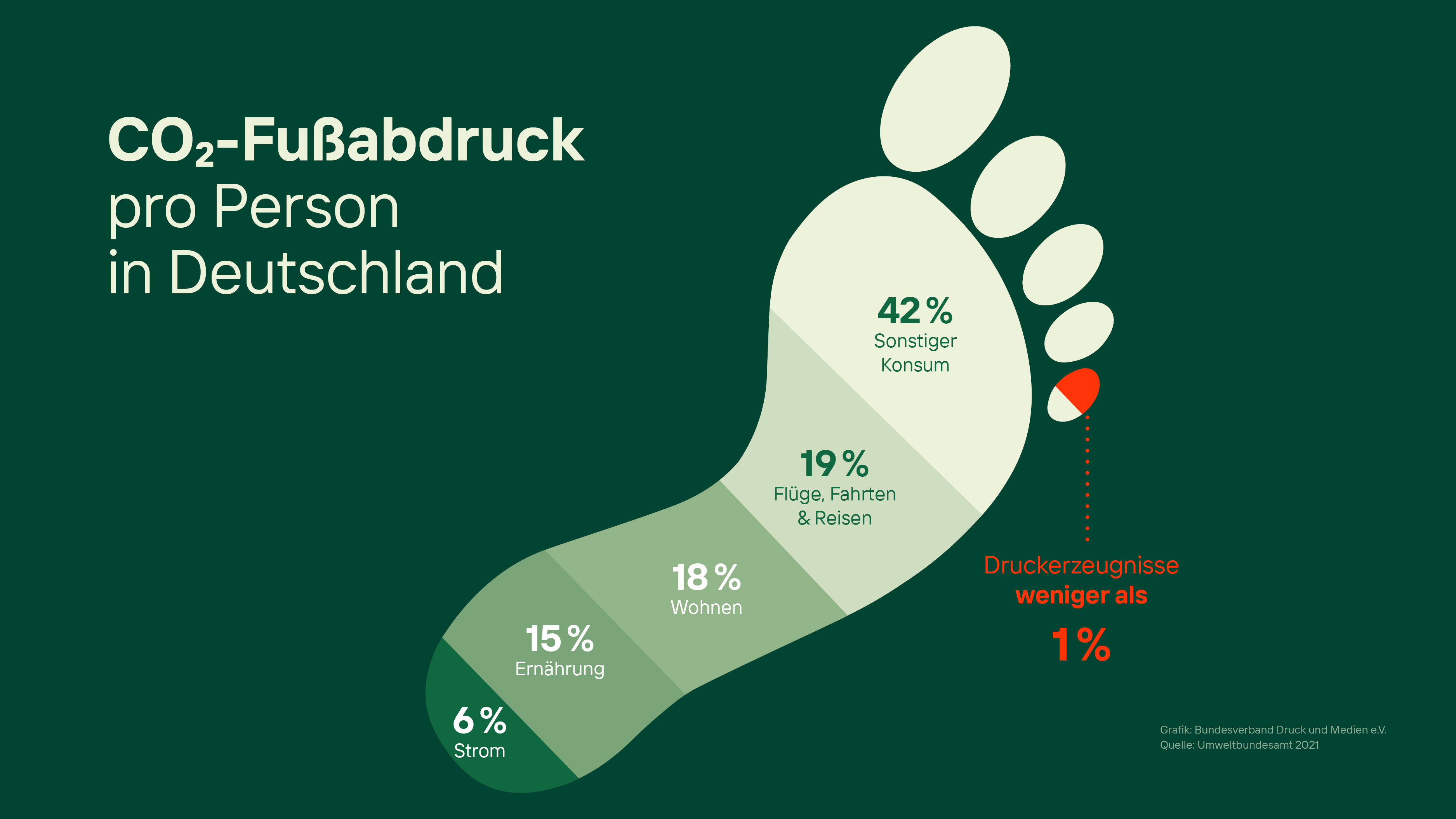 Das Ergebnis: Der CO2-Fußabdruck aller Druckerzeugnisse einer/s durchschnittlichen Bundesbürgers:in in Deutschland macht weniger als ein Prozent des Fußabdrucks aus, den eine Person hierzulande pro Jahr insgesamt hinterlässt.