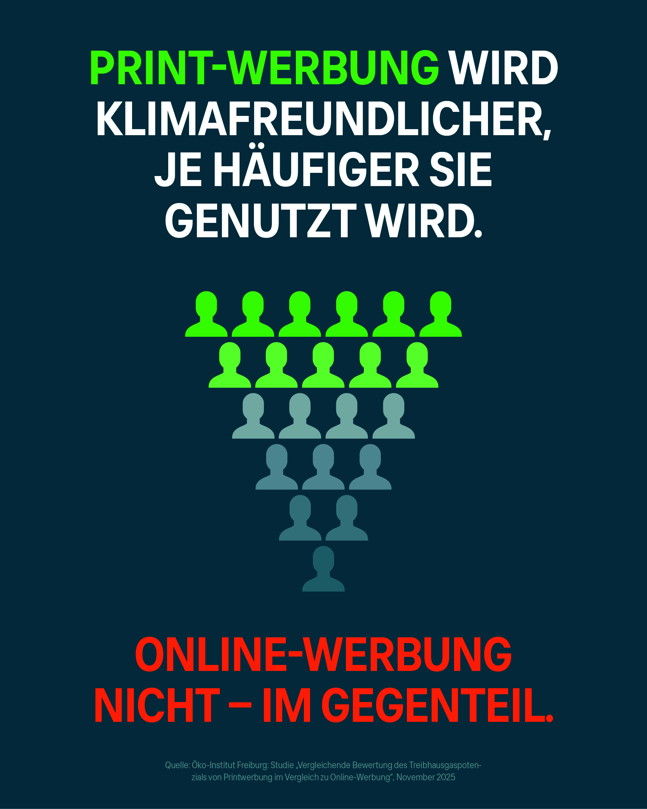 Von den Verbänden BVDM, Austropapier, dpsuisse, Jorcon b. v. (Niederlande) sowie Verband Druck Medien Österreich beauftragt, hat das Öko-Institut Freiburg das Treibhausgaspotenzial – also den CO₂-Fußabdruck – von Printwerbung in Form von Prospekten und Zeitungsanzeigen im Vergleich zu ihren digitalen Pendants Online-Prospekt und Online-Banner untersucht. Die Studie liefert fundierte Argumente für die ökologische Stärke gedruckter Werbung. Denn im direkten Vergleich von Print und Online zeigt sich: Printwerbung schneidet häufig klimafreundlicher ab als Online-Werbung.