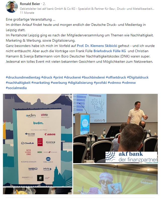 Frank Fülle, CEO der Briefodruck Fülle KG, gab einen Einblick in die Möglichkeiten für Druck- und Medienunternehmen, Unternehmenskommunikation als Erfolgsfaktor in die Geschäftsprozesse zu integrieren. Prof. Dr. Klemens Skibicki, Wirtschaftshistoriker und Unternehmensberater, zeigte die Notwendigkeit für die Druckbranche auf, sich ihren Kundinnen und Kunden sowie Partnern auch digital zu präsentieren, um wettbewerbsfähig zu bleiben.