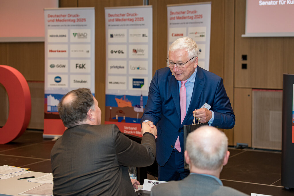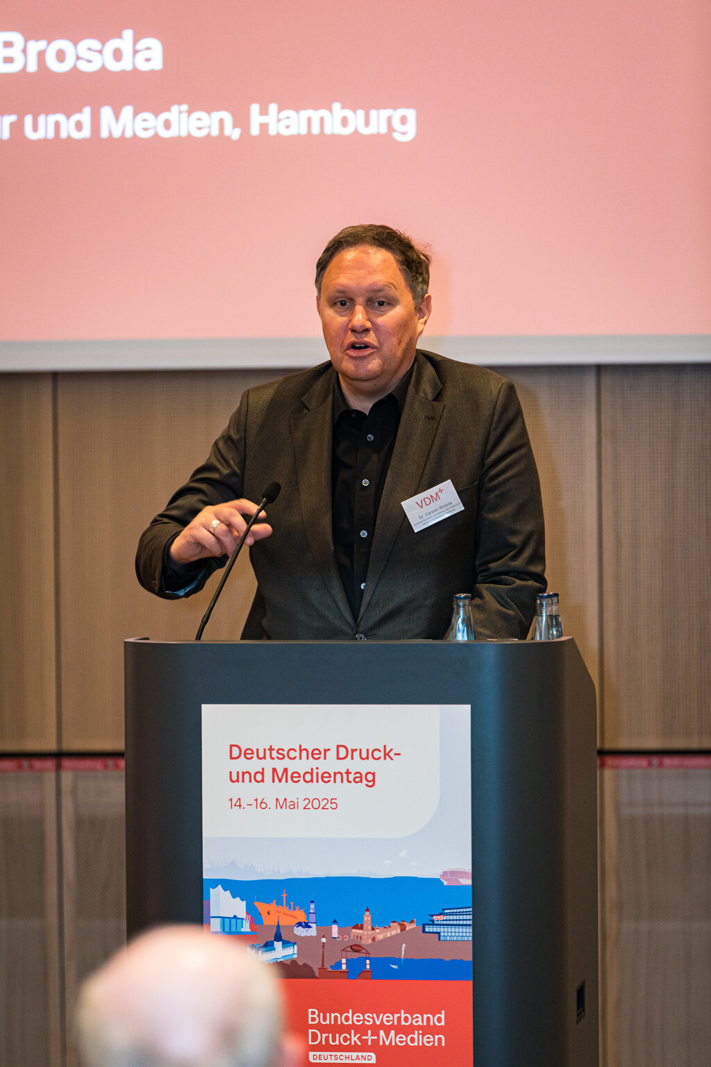 Das Unternehmerforum am 15. Mai beleuchtete eindrucksvoll die Schnittstellen zwischen Arbeitgeber- und Wirtschaftsverbänden, Mittelstand und Sozialpartnerschaft innerhalb der Druck- und Medienwirtschaft im Jahr 2025. Nach der Eröffnung durch Sönke Boyens, Vizepräsident BVDM und Landesvorsitzender des VDMNW, begrüßte Dr. Carsten Brosda, Senator für Kultur und Medien der Freien und Hansestadt Hamburg, die Teilnehmenden mit einer Keynote, in der er einen Bogen zur Hamburger Mediengeschichte spannte. Er sei sich sicher, dass wir auch in Jahrzehnten noch Printprodukte haben werden, so der Senator. Die Frage sei nur, wie sich Print und Digital zukünftig ergänzten. Damit schloss er sich Sönke Boyens an, für den eine Welt ohne Print nicht denkbar wäre. Print sei Vergangenheit, Gegenwart und Zukunft.