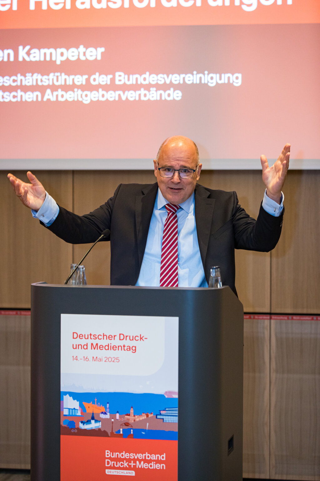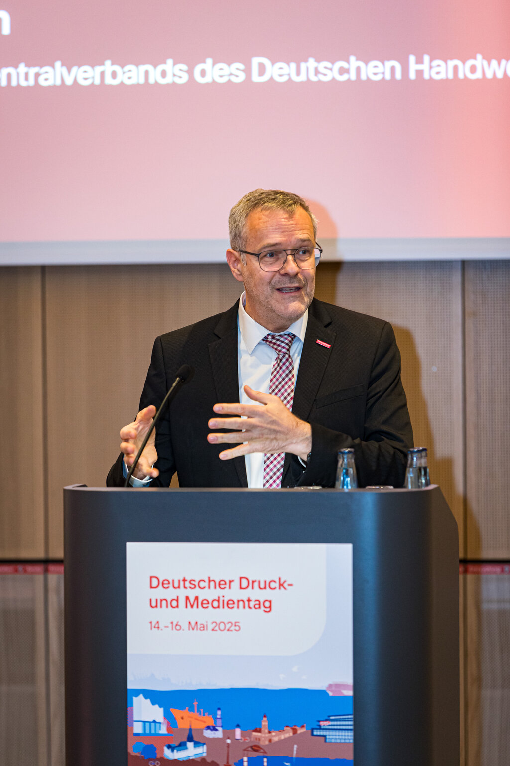 Jörg Dittrich, Präsident des Zentralverbands des Deutschen Handwerks, richtete den Fokus in seinem Vortrag „Mittelstand – gepriesen und belastet“ auf die zentrale Rolle mittelständischer Unternehmen in der Branche. Mit einem klaren Appell forderte er eine Gesetzgebung, die sich nicht primär an großen Konzernen, sondern an den Bedürfnissen des Mittelstands orientiert. Denn, so betonte er, 99,8 Prozent aller Betriebe in Deutschland würden im europäischen Vergleich kleinen und mittleren Unternehmen zugeordnet. Auch die Druck- und Medienunternehmen sind zum Großteil kleine und mittlere Betriebe.