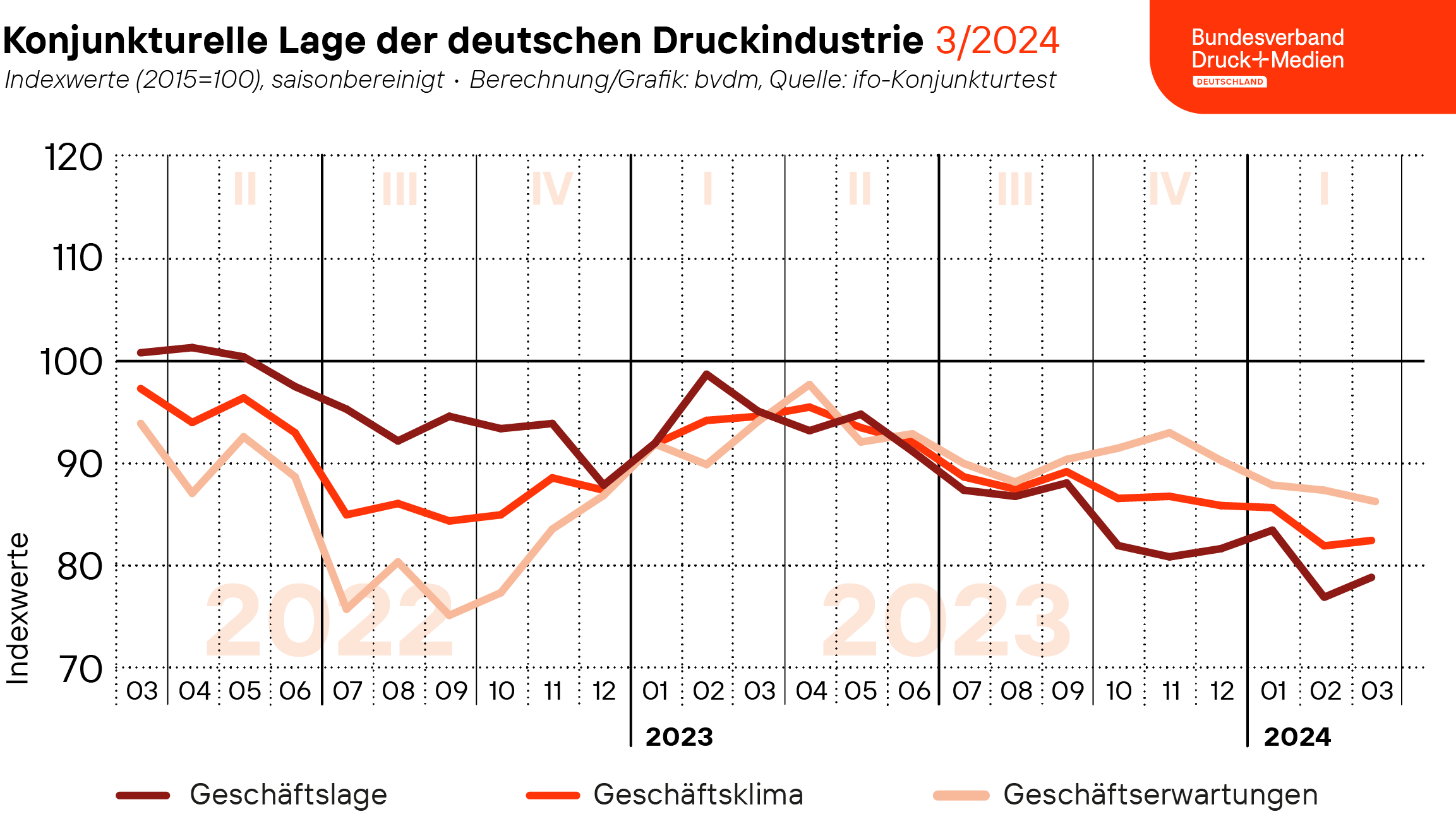 Nach dem deutlichen Rückgang im Februar stabilisierte sich die Entwicklung des saison- und kalenderbereinigten Geschäftsklimas der deutschen Druck- und Medienwirtschaft im März 2024. Während die Geschäftsaussichten für die nächsten 6 Monate im Vergleich zum Februar leicht absanken, steigen die Einschätzungen der aktuellen Geschäftslage moderat an. Der vom Bundesverband Druck und Medien berechnete Geschäftsklimaindex verzeichnete saison- und kalenderbereinigt rund 0,6 Prozent über dem Vormonatswert. Mit 82,7 Punkten notierte der Index im März rund 12,8 Prozent unter seinem Vorjahresniveau.