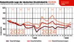 Im März 2025 verzeichnete der saisonbereinigte Geschäftslageindex im Vergleich zum Februar einen Rücksetzer. Mit 83,9 Punkten notierte der Index rund 2,0 Prozent niedriger als im Vormonat. Im Vergleich zum Vorjahr lag der Index damit rund 4,8 Prozent über dem entsprechenden Monat sowie rund 1,4 Prozent über dem Vorjahresmittel. Trotz des Rückgangs zeigt sich in der Beurteilung des aktuellen Auftragsbestands im März eine Verbesserung. Mit im Saldo -35 Prozentpunkten fällt diese zwar weiterhin überwiegend negativ aus, steigt im Vorjahresvergleich jedoch um rund 20 Prozentpunkte. Auch der Saldo der saisonalen Nachfrageentwicklung steigt im Vorjahresvergleich um rund 10 Prozentpunkte und liegt saisonbedingt mit einem Saldo von 11 Prozent im positiven Bereich.
