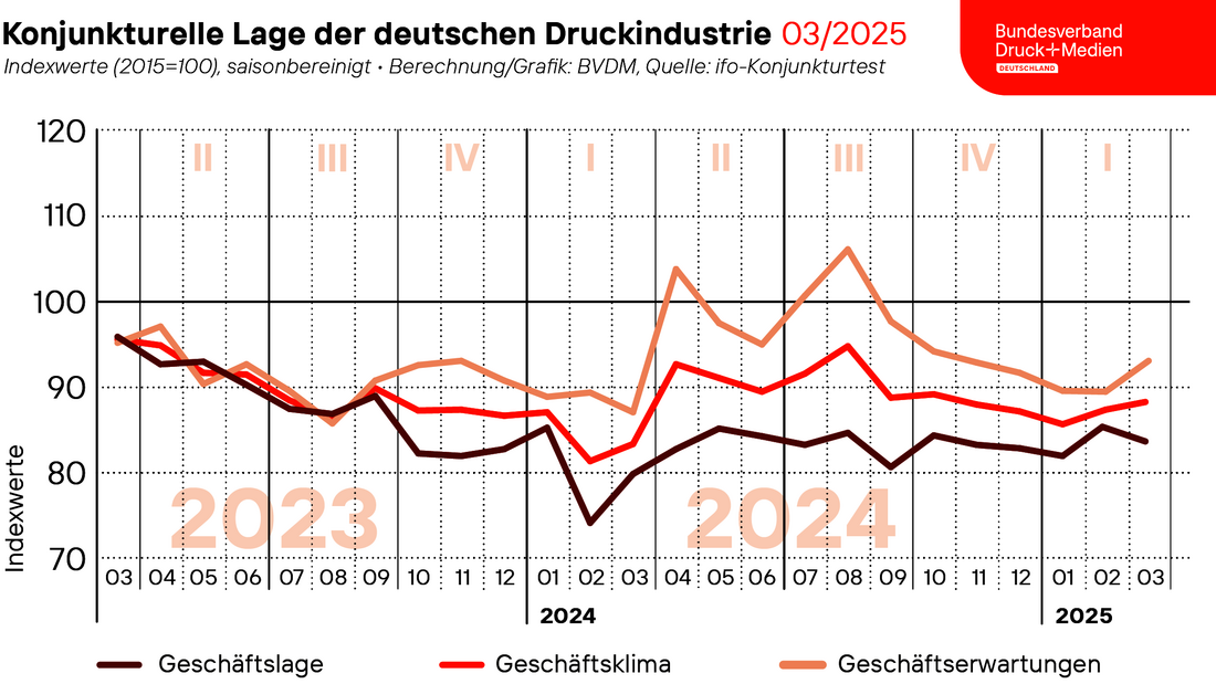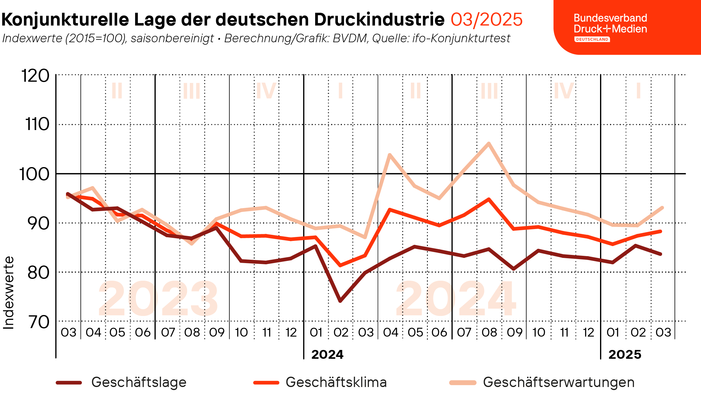 Im März 2025 verzeichnete das saisonbereinigte Geschäftsklima der deutschen Druck- und Medienindustrie nach der Verbesserung im Februar den zweiten Anstieg in Folge. Während sich bei den Geschäftsaussichten für die nächsten 6 Monate im März eine positive Trendwende andeutete, ging die Einschätzung der aktuellen Geschäftslagebewertung leicht zurück. Der vom Bundesverband Druck- und Medien ermittelte Geschäftsklimaindex wies gegenüber dem Vormonat einen saisonbereinigten Zuwachs von 1,0 Prozent auf. Mit 88,5 Punkten notierte der Index im März rund 5,8 Prozent über dem Niveau des Vorjahres.