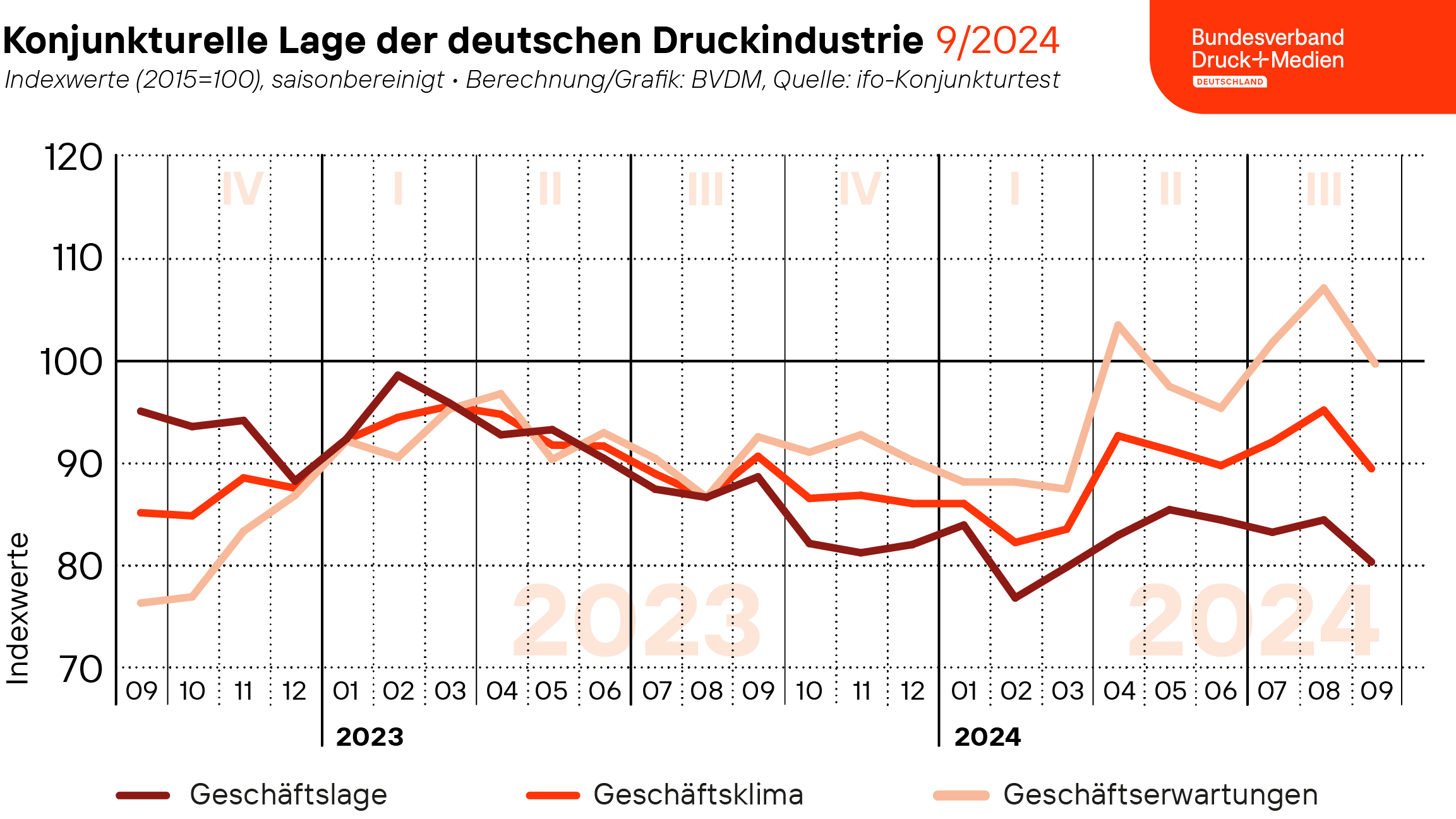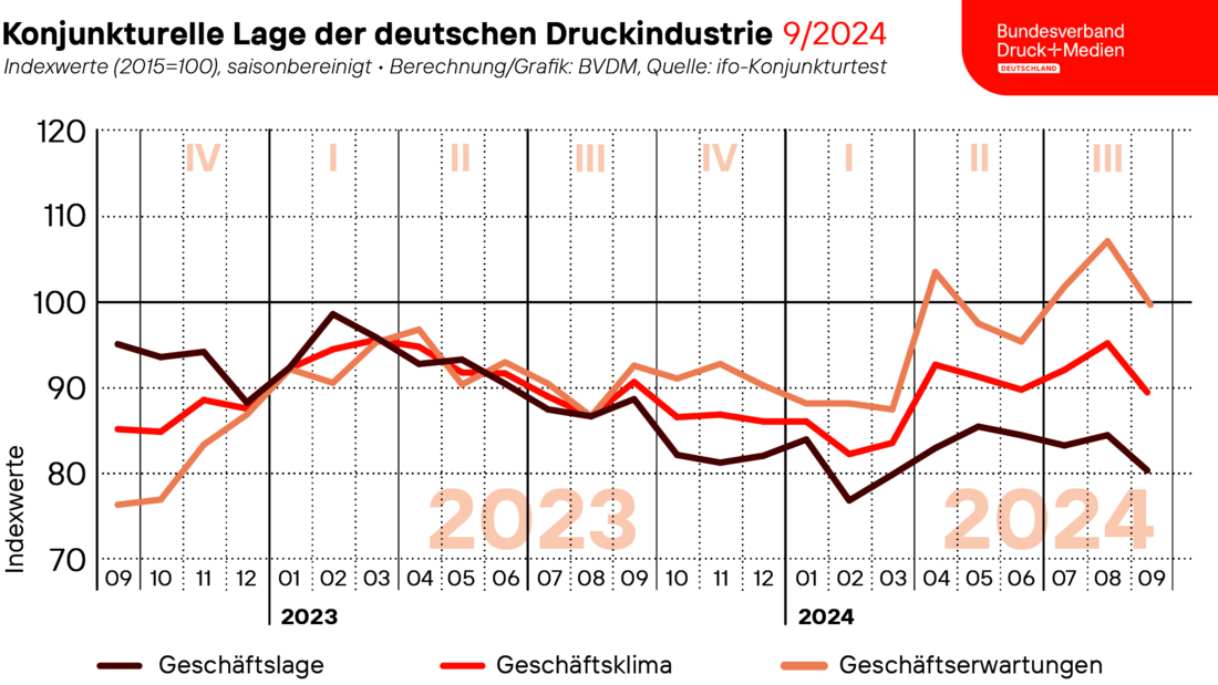 Nach der positiven Entwicklung im August verschlechterte sich die Stimmung der Unternehmen in der deutschen Druck- und Medienwirtschaft im September 2024 deutlich. Der vom Bundesverband Druck und Medien ermittelte Geschäftsklimaindex verzeichnete mit einem saison- und kalenderbereinigten Minus von rund 5,9 Prozent den stärksten Vormonatsverlust in diesem Jahr. Mit 89,7 Punkten notierte der Index im September damit erneut rund 1,2 Prozent unter seinem Vorjahresniveau. Maßgeblich bestimmt wurde die Entwicklung sowohl durch eine Verschlechterung der aktuellen Geschäftslage als auch durch einen deutlichen Rückgang der Geschäftsaussichten.