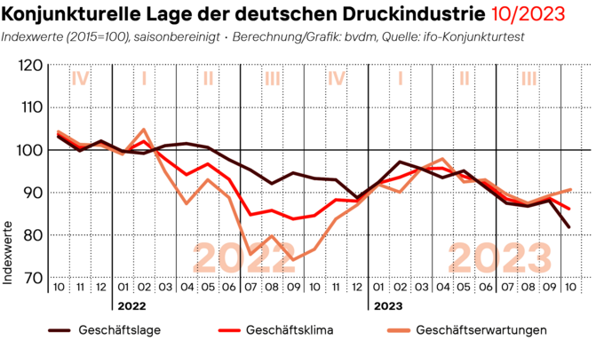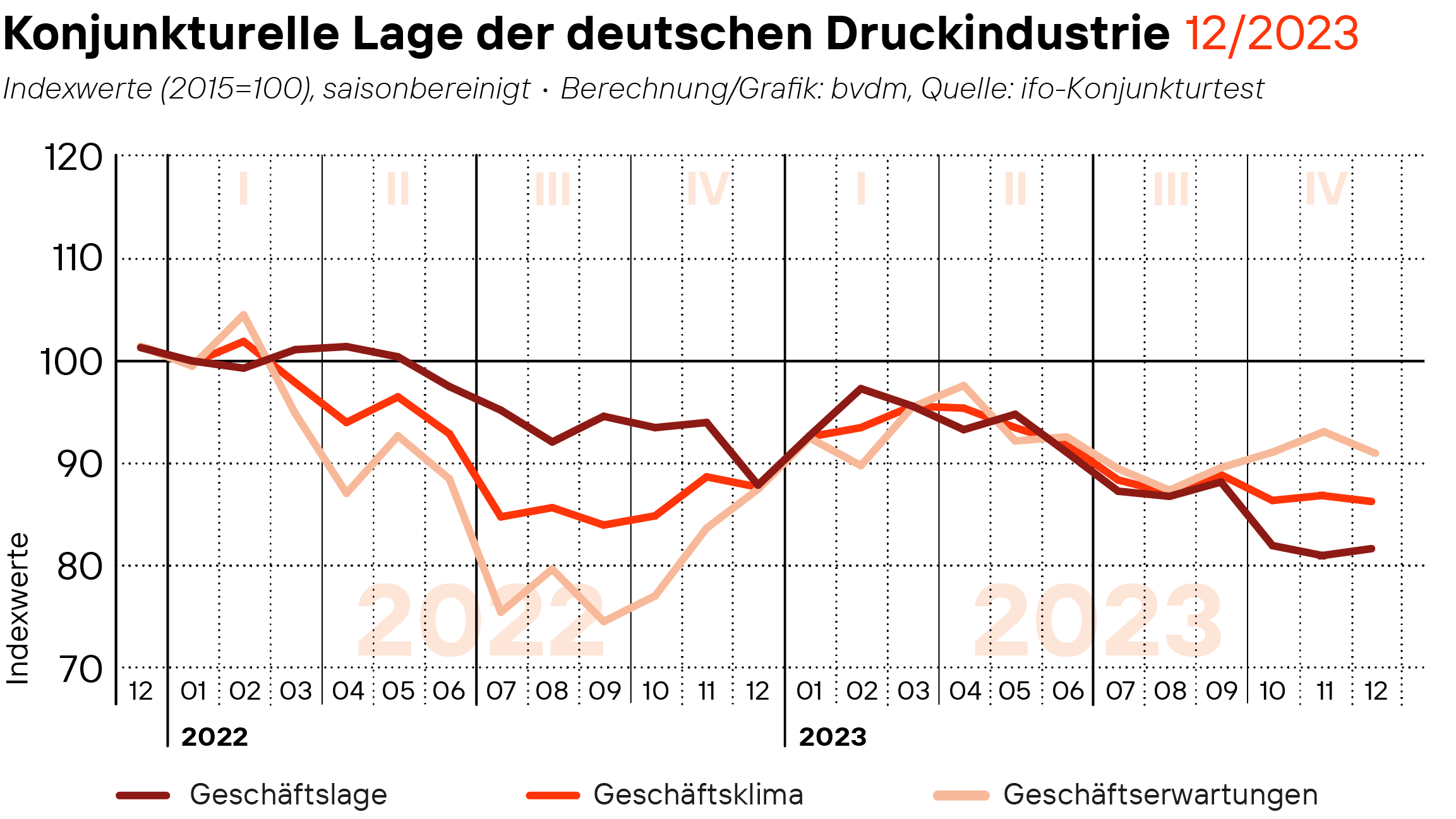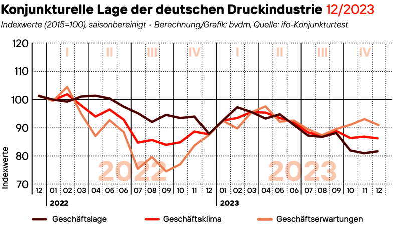 Zum Jahresende 2023 verzeichnete das saison- und kalenderbereinigte Geschäftsklima der deutschen Druck- und Medienbranche einen leichten Rückgang. Während die Geschäftsaussichten für die nächsten 6 Monate merklich zurückgingen, stiegen die Einschätzungen hinsichtlich der aktuellen Geschäftslage leicht an. Der vom Bundesverband Druck- und Medien berechnete Geschäftsklimaindex sank saison- und kalenderbereinigt um 0,7 Prozent im Vergleich zum Vormonat ab. Mit 86,5 Punkten notierte der Index im Dezember rund 1,7 Prozent unter seinem Vorjahresniveau und bildete damit den Jahrestiefstand.
