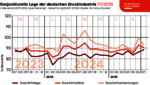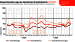 Im Juli 2025 bewerteten die vom ifo Institut befragten Entscheider der Druck- und Medienunternehmen ihre aktuelle Geschäftslage besser als im Vormonat. Die Einschätzungen im Hinblick auf die nächsten 6 Monate fielen in diesem Monat jedoch deutlich pessimistischer aus. Die Ausprägungen der aktuellen und erwarteten Geschäftslage bestimmen die Entwicklung des Geschäftsklimas, das einen guten Vorlaufindikator für die Produktionsentwicklung der Druck- und Medienindustrie darstellt.