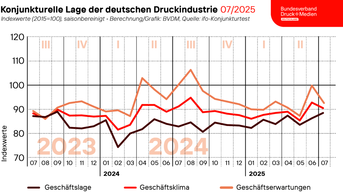 Im Juli 2025 verschlechterte sich das saisonbereinigte Geschäftsklima der deutschen Druck- und Medienindustrie leicht. Der vom Bundesverband Druck und Medien ermittelte saisonbereinigte Geschäftsklimaindex wies gegenüber dem Vormonat einen Rückgang von 2,5 Prozent auf. Mit 90,7 Punkten lag der Index damit im Juni rund 0,7 Prozent unter dem Niveau des Vorjahresmonats. Die aktuelle Lageeinschätzung fiel deutlich optimistischer aus als noch im Vormonat, jedoch trübten sich die Geschäftsaussichten für die nächsten sechs Monate deutlich ein. Dies schlägt sich auch im Rückgang des Geschäftsklima für Juli nieder.