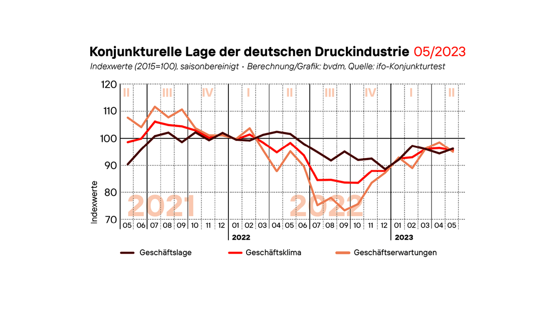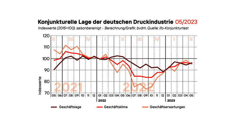 Berlin, 02.06.2023. Im Mai 2023 stagnierte das saison- und kalenderbereinigte Geschäftsklima der deutschen Druck- und Medienbranche, sinkende Geschäftserwartungen bestimmten dabei maßgeblich die Entwicklung. Der vom Bundesverband Druck und Medien berechnete Geschäftsklimaindex ging saisonbereinigt um 0,8 Prozent im Vergleich zum Vormonatsniveau zurück. Mit 95,8 Punkten notierte der Index damit rund 2,8 Prozent unter seinem Vorjahresniveau.