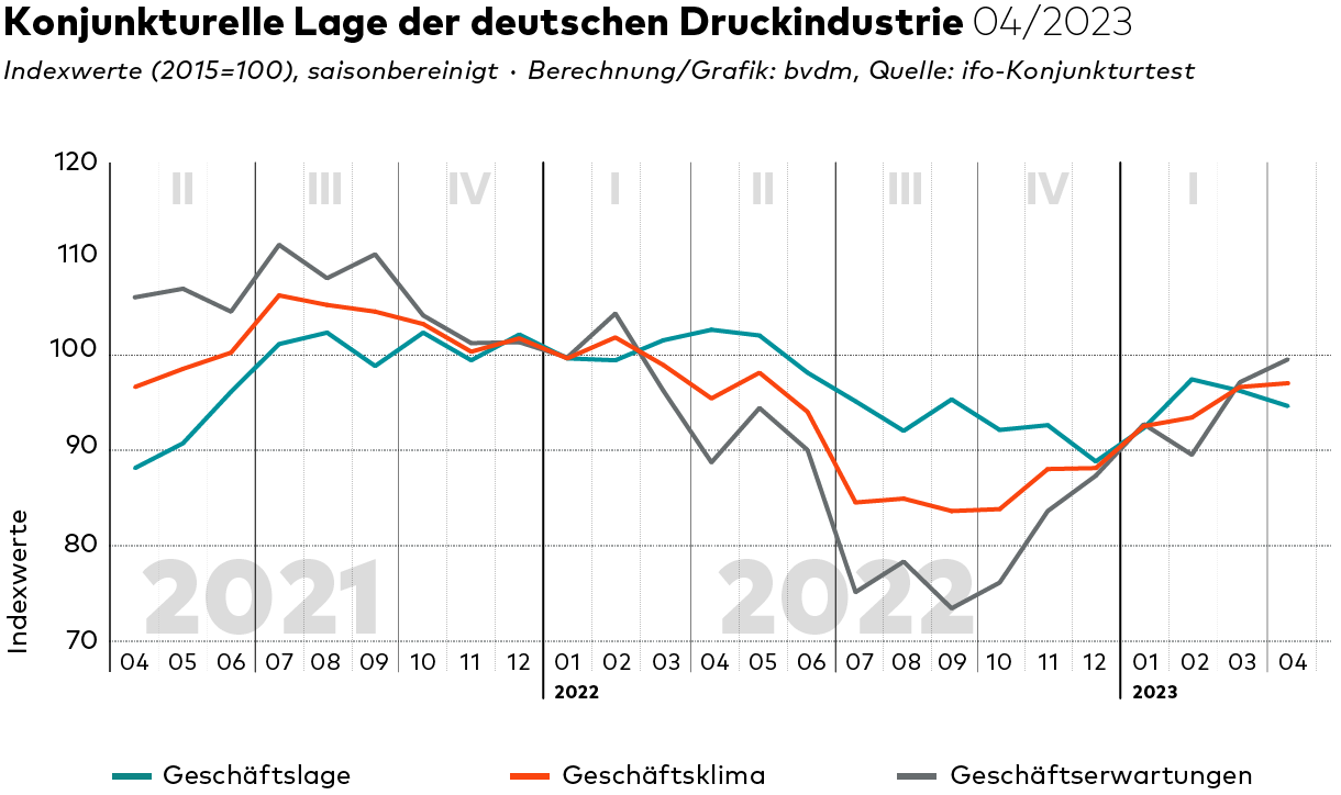 Im Mai 2023 bewerteten die vom ifo Institut befragten Entscheider der Druck- und Medienunternehmen ihre aktuelle Geschäftslage etwas besser als im Vormonat. Im Gegensatz dazu brach der positive Trend bei den Erwartungen hinsichtlich der Geschäftsentwicklung der nächsten sechs Monate ab. Die Werte für das Geschäftsklima stagnierten daher mit einem negativen Vorzeichen. Die Ausprägungen der aktuellen und erwarteten Geschäftslage bestimmen die Entwicklung des Geschäftsklimas, das einen guten Vorlaufindikator für die Produktionsentwicklung der Druck- und Medienindustrie darstellt.