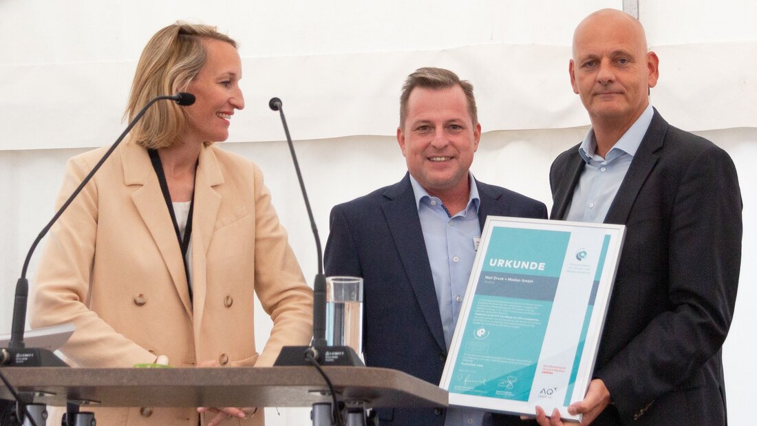 Anlässlich des 90-jährigen Jubiläums der Mail Druck + Medien GmbH nahm Stefan Mail, Geschäftsführer der Mail Druck + Medien GmbH die Urkunde der BVDM-Klimainitiative entgegen. Feierlich überreicht wurde die Urkunde durch Kirsten Hommelhoff, Hauptgeschäftsführerin des Bundesverbands Druck und Medien (BVDM) gemeinsam mit Jens Meyer, Geschäftsführer VDM Beratung. „Die Initiative von Mail Druck + Medien ist ein starkes Signal für die gesamte Druckbranche. Es zeigt, dass nachhaltiges Wirtschaften und Innovation Hand in Hand gehen können. Und es zeigt einmal mehr, wie umweltbewusst und nachhaltig die Druckindustrie handelt“, erklärte Kirsten Hommelhoff in Ihrer Ansprache.